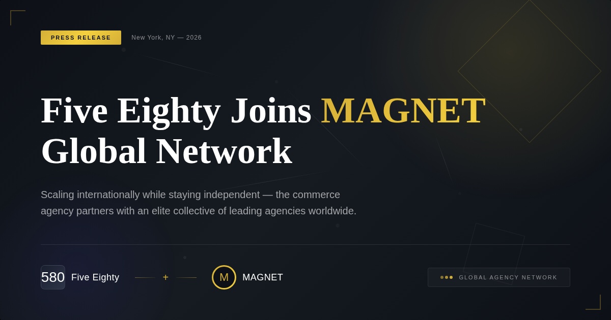MAGNET is an invite only collective of independent agencies across advertising, marketing, and digital disciplines. Membership is based on shared values, high performance standards, and a commitment to collaboration over consolidation. For Five Eighty, the partnership enables broader global support while preserving its commerce first focus and hands on approach.